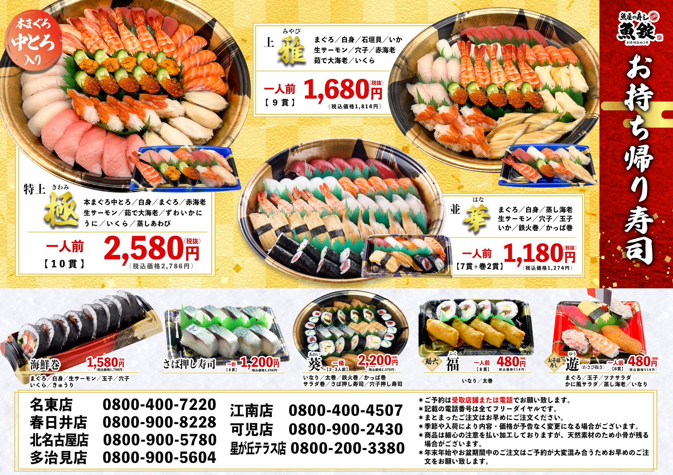 お受け取りの店舗店頭またはお電話にてご予約ください。 年末年始やお盆などのイベント時や、時間帯によって混雑する場合がございますので、 お早めにご注文ください。 ■お持ち帰り寿司 ※宅配は行っておりません。 ※価格に容器、包装代も含まれております。 ※複数個を同時にお会計しますと一つずつ会計した場合と比べ、差額が生じる場合がございます。